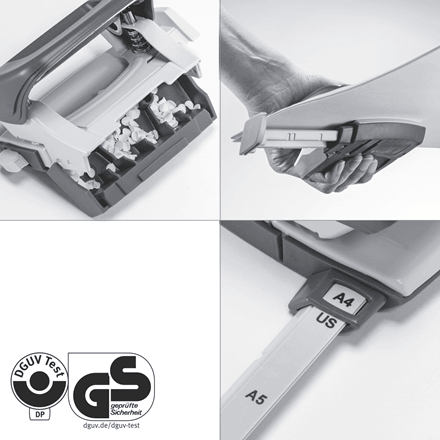- wyraźne oznaczenia formatu i wytrzymała prowadnica zapewniają perfekcyjne wyrównanie papieru